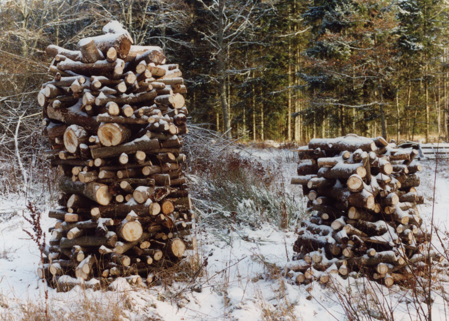 Dimme 1, 30 Festmeter Holz, gesägt, gespalten, gestapelt, getrocknet, gelagert, verheizt. Davon machten wir jedes Jahr 5 Stück. So war Edestad. Gewiss ist das eine praktische Anwendung. Wenn aber Ende Juni die Arbeit getan war und man betrachtete das Werk, kam das Gefühl auf hier eine Installation geschaffen zu haben, bestehend aus gigantischen Skulpturen. Hinzu kamen die kleineren Dimmen, die aus Gartenschnitt gefertigt wurden.